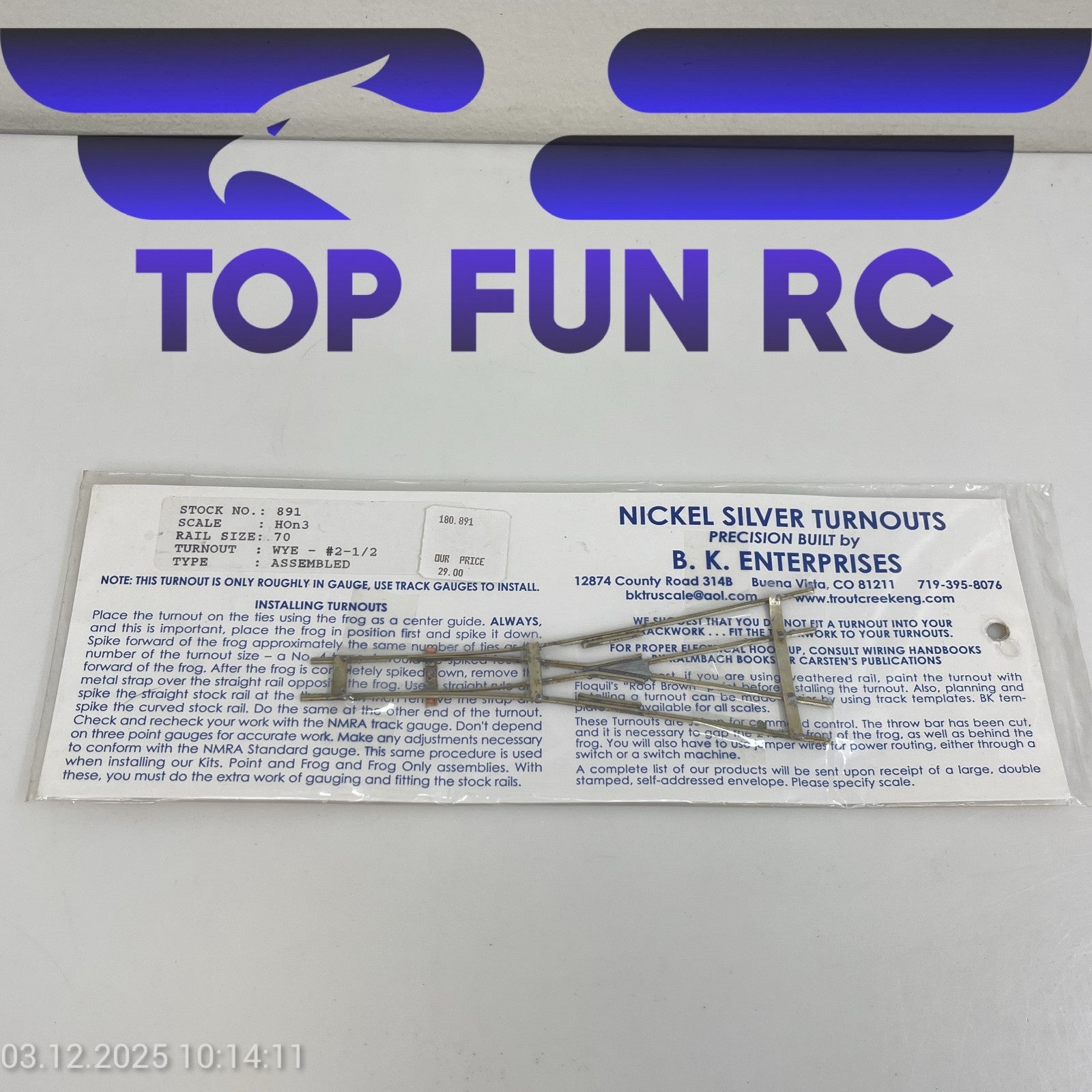 B.K. ENTERPRISES 891 HOn3 NICKEL SILVER TURNOUT WYE-#2-1/2 ASSEMBLED TYPE